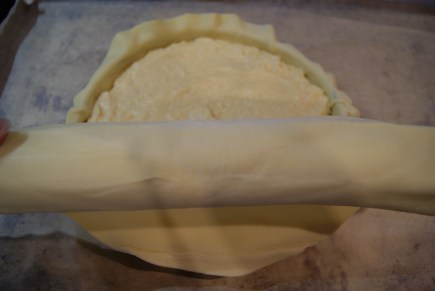 - Mouiller les bords de la pâte et recouvrir d’une autre couche de pâte feuilletée
